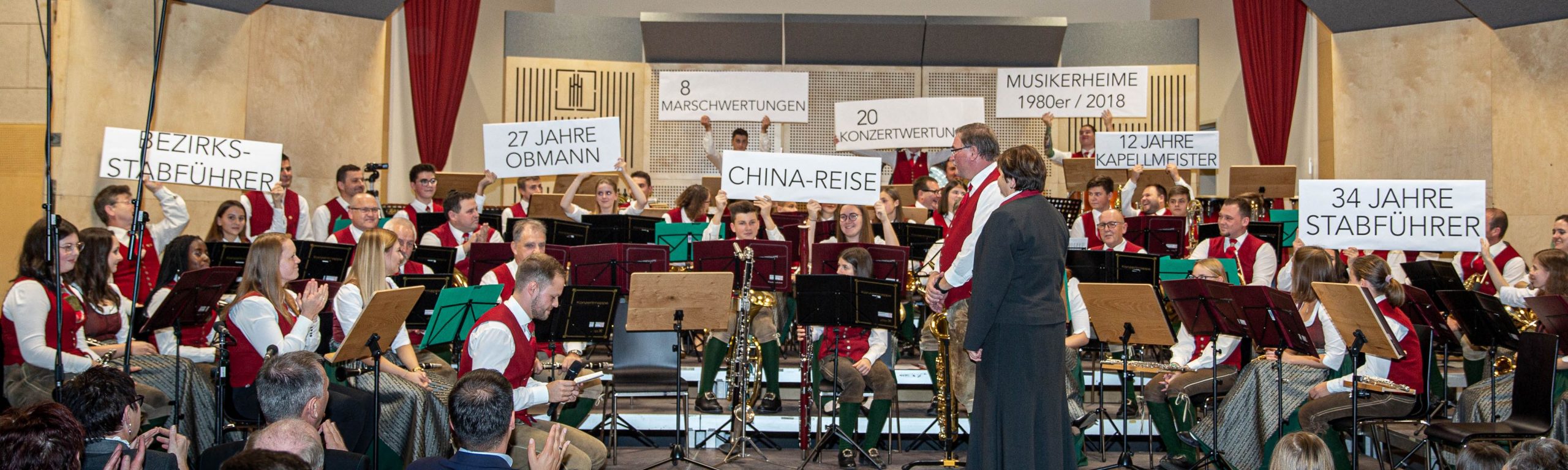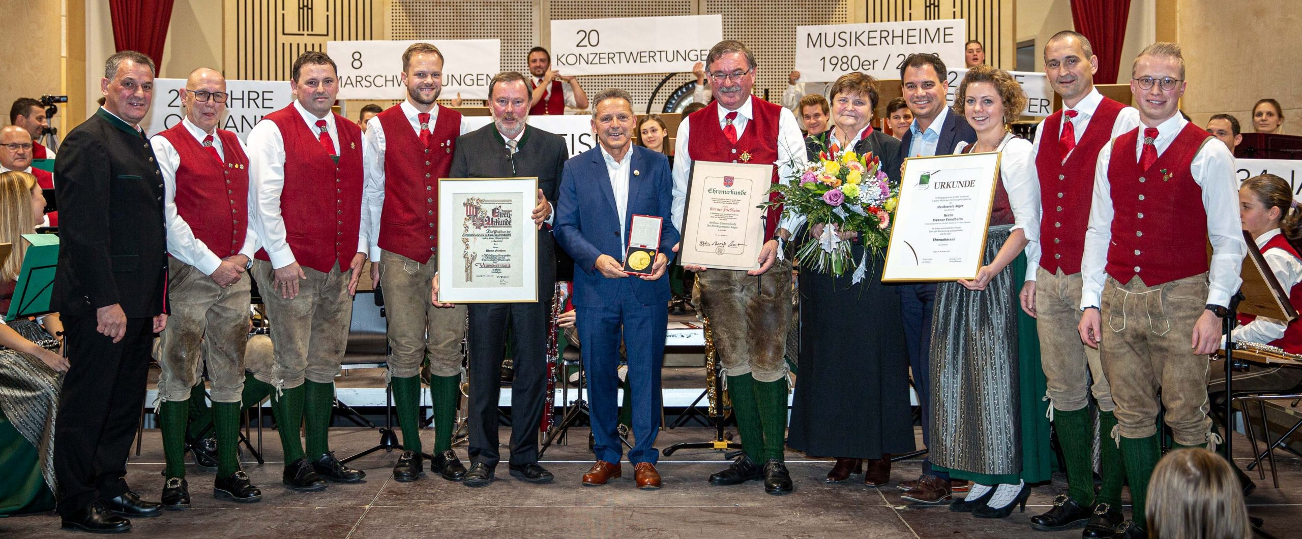 Vor dem fünften Stück ergriff dann Obmann Michael Derler das Wort und lüftete ein Geheimnis – er bat Werner Friedheim und seine Frau Maria auf die Bühne. Für seine außerordentlichen Verdienste in seiner 48-jährigen Mitgliedschaft – davon 12 Jahre als Kapellmeister, 34 Jahre als Stabführer und 27 Jahre als Obmann – wurde Werner Friedheim zum Ehrenobmann des Musikvereines Anger ernannt. Den Reigen der Ehrungen setzte Erich Riegler, Präsident des Österreichischen Blasmusikverbandes, fort, der danach das Wort ergriff und ihm für seine Verdienste in der Blasmusik auf Vereins- und Bezirksebene das Verdienstkreuz des Österreichischen Blasmusikverbandes in Gold verlieh. Bürgermeister Hubert Höfler überreichte Werner darauf die goldene Ehrenmedaille der Marktgemeinde Anger. Auch der stellvertretende Landeshauptmann Michael Schickhofer sprach ihm ehrende und dankende Worte aus.